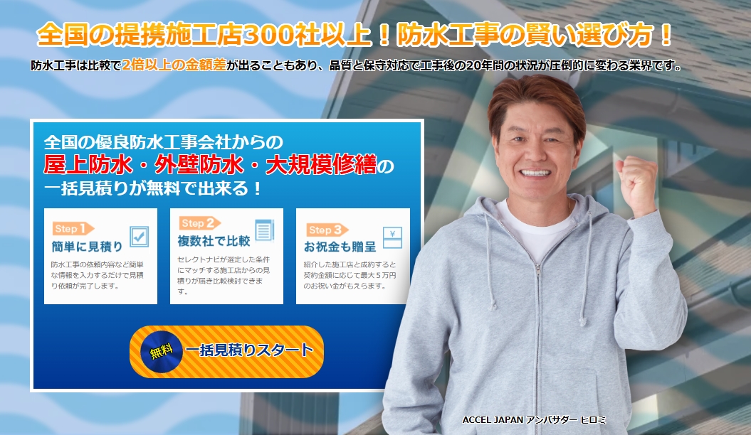 「防水工事セレクトナビ」は、全国300社以上の信頼できる業者から一括で見積もりを取得できる無料の比較サイトです。