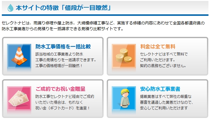 このような疑問を抱える方におすすめなのが、防水工事の見積もり比較ができる専門サイト「防水工事セレクトナビ」です。
