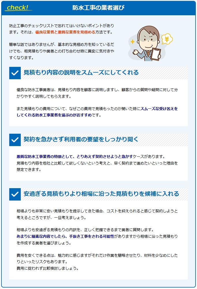 「どんな種類の防水工事を選べばいいの?」「見積もりの適正価格っていくら?」「信頼できる業者をどう探せば?」
